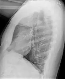 The underlying mechanism involves injury and inflammation of epithelial and sub-epithelial cells. These cells then lose the ability to repair the tissue, in particular they lose the ability to regenerate the epithelial or outermost layer, leading to the excess growth of cells that cause scarring.[11][6][1] There are multiple pathways of the disease including fibrotic, lymphocytic, and antibody-mediated that have been described. However, while each pathway has a more unique starting point and cause, the end result is still injury and inflammation leading to scarring of the lung tissue.[11] The scarred tissue then makes the expiration phase of respiration more difficult, leading to air not being expelled from the lungs. This is termed "air-trapping", which can be seen on medical imaging.[6] Since the scarring is non-reversible, the disease generally does not improve over time, and depending on the inciting can progress to death.[11]