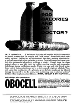 In an advertisement published by the New York Academy of Medicine,[6] whose target audience was physicians, Obocell was touted as "helping the obese patient adhere to your diet chart by curbing gnawing appetite and suppressing bulk hunger during and between meals". It was advertised to physicians with portly figurines called "Mr. Obocell" and "Mrs. Obocell."[8][9]