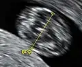 Biparietal diameter (the transverse diameter of the head) by gestational age, with the blue line representing the mean and the green area representing the 90% prediction interval.[14]