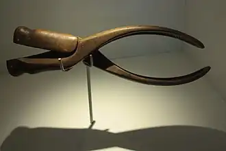 In 1813, Peter Chamberlen's midwifery tools were discovered at Woodham Mortimer Hall near Maldon (UK) in the attic of the house. The instruments were found along with gloves, old coins and trinkets.[14] The tools discovered also contained a pair of forceps that were assumed to have been invented by the father of Peter Chamberlen because of the nature of the design.[15]