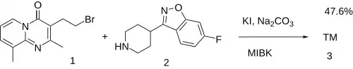 The last step requires attachment of the sidechain between 3-(2-bromoethyl)-2,9-dimethyl 4H-pyrido[1,2-a]pyrimidin-4-one (1) and 6-fluoro-3-(4-piperidinyl)-1,2-benzisoxazole (2) completing the convergent synthesis of ocaperidone (3).