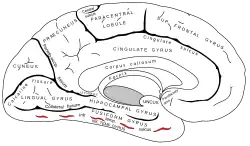 ![]() Medial surface of left cerebral hemisphere. The picture shows a dashed outline in red, known as the occipitotemporal sulcus.[1] | |