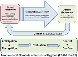 Occupational hygiene or industrial hygiene (IH) is the anticipation, recognition, evaluation, control, and confirmation (ARECC) of protection from risks associated with exposures to hazards in, or arising from, the workplace that may result in injury, illness, impairment, or affect the well-being of workers and members of the community. These hazards or stressors are typically divided into the categories biological, chemical, physical, ergonomic and psychosocial.[1] The risk of a health effect from a given stressor is a function of the hazard multiplied by the exposure to the individual or group.[2] For chemicals, the hazard can be understood by the dose response profile most often based on toxicological studies or models. Occupational hygienists work closely with toxicologists (see Toxicology) for understanding chemical hazards, physicists (see Physics) for physical hazards, and physicians and microbiologists for biological hazards (see Microbiology, Tropical medicine, Infection). Environmental and occupational hygienists are considered experts in exposure science and exposure risk management. Depending on an individual's type of job, a hygienist will apply their exposure science expertise for the protection of workers, consumers and/or communities.