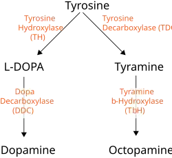 - ↑ Schützler N, Girwert C, Hügli I, Mohana G, Roignant JY, Ryglewski S, et al. (February 2019). "Tyramine action on motoneuron excitability and adaptable tyramine/octopamine ratios adjust Drosophila locomotion to nutritional state". Proceedings of the National Academy of Sciences of the United States of America. 116 (9): 3805–3810. Bibcode:2019PNAS..116.3805S. doi:10.1073/pnas.1813554116. PMC 6397572. PMID 30808766.