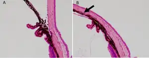 b) Anterior segment of laser-treated a) and control eye was histologically assessed. The arrow indicates the closed angle induced by laser photocoagulation.