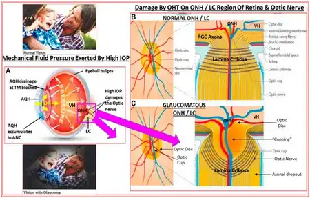 a-c)Image of how the raised IOP in anterior chamber of eye exerts mechanical compressive pressure on optic nerve head [7]