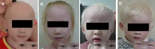 - ↑ 18.0 18.1 18.2 Montoliu L, Grønskov K, Wei A, Martínez-García M, Fernández A, Arveiler B, Morice-Picard F, Riazuddin S, Suzuki T, Ahmed Z, Rosenberg T, Li W (January 2014). "Increasing the complexity: new genes and new types of albinism". Pigment Cell & Melanoma Research. 27 (1): 11–18. doi:10.1111/pcmr.12167. PMID 24066960.