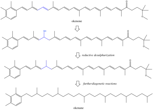 Pigments and other biomarkers produced by organisms can evade microbial and chemical degradation and persist in sedimentary rocks.[8] Under conditions of preservation, the environment is often anoxic and reducing, leading to chemical loss of functional groups like double bonds and hydroxyl groups. The exact reactions during diagenesis are poorly understood, although some have proposed reductive desulphurization as a mechanism for saturation of okenone to okenane.[9][10] There is always the possibility that okenane is created by abiotic reactions, possibly from methyl shifts in β-carotene.[11] If this reaction was occurring, okenane would have multiple precursors and the biological specificity of the biomarker would be diminished. However, it is unlikely that isomer specific rearrangements of two methyl groups are occurring without enzymatic activity. The majority of studies conclude that okenane is a true biomarker of purple sulfur bacteria. However, other biological arguments against this interpretation hold merit.[12] Past organisms that synthesized okenone may not be modern analogues of purple sulfur bacteria. There may also be other okenone producing photosynthesizers in today's ocean that are uncharacterized. A further complication is horizontal gene transfer.[13] If Chromatiaceae gained the ability to create okenone more recently that the Paleoproterozoic, then the okenane does not track purple sulfur bacteria, but rather the original gene donor. These ambiguities indicate that interpretation of biomarkers in billion-year-old rocks will be limited by understanding of ancient metabolisms.