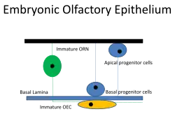 The embryonic olfactory epithelium consists of fewer cell types than in the adult, including apical and basal progenitor cells, as well as immature olfactory sensory neurons.[9] Early embryonic neurogenesis relies mostly on the apical cells, while later stage embryonic neurogenesis and secondary neurogenesis in adults relies on basal stem cells.[10] The axons of the immature olfactory sensory neurons, along with a mixed population of migratory cells, including immature olfactory ensheathing cells and gonadotropin-releasing hormone neurons form a "migratory mass" that travels towards the olfactory bulb.[9][10] At the end of the embryonic stage, the epithelium develops into a pseudostratified columnar epithelium and begins secondary neurogenesis.[9]