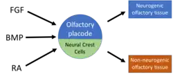 Neurogenic placodes are transient, focal aggregations of ectoderm located in the developmental region of the future vertebrate head, and give rise to sensory organs.[11] Early cranial sensory placodes are marked by expression of Six1, part of the Six family of transcription factors that regulate the preplacodal specification.[12] The olfactory placode forms as two thickenings of non-neural region of embryonic ectoderm.[13] In mice, the olfactory placode derives from an anterior portion of the neural tube, ~9-9.5 days into development and not long after the closure of the neural plate.[9] Development of the olfactory placode requires the presence underlying neural crest-derived mesenchymal tissue.[12] The specification of the olfactory placode tissue involves signaling of multiple gene networks, beginning with signals from bone morphogenetic proteins (BMP), retinoic acid (RA), and fibroblast growth factor (FGF), specifically FGF8.[14] The resulting regulated downstream expression of transcription factors, such as Pax6, Dlx3, Sox2, and others, within the presumptive olfactory placode are crucial for sub-regionalization within the future olfactory epithelium and is responsible for the diversity of cells that compose the future epithelium.[9][12][15]