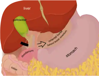 ![]() Entry to omental bursa (black arrow) by omental foramen (white mark) | |