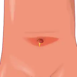 Omphalitis of newborn is the medical term for inflammation of the umbilical cord stump in the neonatal newborn period, most commonly attributed to a bacterial infection.[1] Typically immediately after an infant is born, the umbilical cord is cut with a small remnant (often referred to as the stump) left behind. Normally the stump separates from the skin within 3–45 days after birth.[2] A small amount of pus-like material is commonly seen at the base of the stump and can be controlled by keeping the stump open to air to dry.[3] Certain bacteria can grow and infect the stump during this process and as a result significant redness and swelling may develop, and in some cases the infection can then spread through the umbilical vessels to the rest of the body.[3] While currently an uncommon anatomical location for infection in the newborn in the United States, it has caused significant morbidity and mortality both historically and in areas where health care is less readily available. In general, when this type of infection is suspected or diagnosed, antibiotic treatment is given, and in cases of serious complications surgical management may be appropriate.[3]