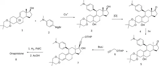 Reaction of the steroid derivative (1) and the Grignard reagent 4-(dimethylamino)phenylmagnesium bromide (2) gives (3) by vinylogous addition to the epoxide. Oxidation of the alcohol group in the five-membered ring to a ketone gives compound (4). Irradiation of this material for 16 minutes with a mercury lamp results in the methyl group adjacent to the ketone changing from the beta to the alpha configuration, giving (5). Alkynylation with the anion formed from the acetylene derivative (6) using butyllithium gives (7). Catalytic hydrogenation to convert the alkyne group to an alkyl group, followed by acid treatment to remove the protecting groups yielded onapristone.[11][12]