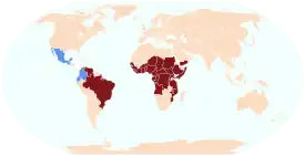 About 99% of cases of onchocerciasis are found in 31 countries in sub-Saharan Africa, although areas of limited transmission occur in Brazil, Venezuela, and Yemen.[25] The disease is thought to have been imported into Latin America through the slave trade.[28] Onchocerciasis was eliminated from Colombia in 2013, Ecuador in 2014, Mexico in 2015, and Guatemala in 2016[26] due to control programs that used mass drug administration with ivermectin.[25]