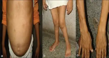 | a) Café au lait spots b) Genu valgum. c) nodules on forearm | |