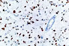 A micrograph showing cells with abnormal p53 expression (brown) in a brain tumor.