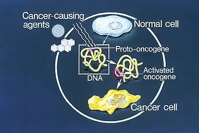 Illustration of how a normal cell is converted to a cancer cell, when an oncogene becomes activated.
