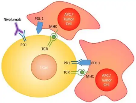 - ↑ Rajan A, Kim C, Heery CR, Guha U, Gulley JL (September 2016). "Nivolumab, anti-programmed death-1 (PD-1) monoclonal antibody immunotherapy: Role in advanced cancers". Human Vaccines & Immunotherapeutics. 12 (9): 2219–31. doi:10.1080/21645515.2016.1175694. PMC 5027703. PMID 27135835.