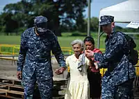 Escorting a patient into the clinic during Operation Continuing Promise 2011 in Acajutla, El Salvador, (July 15, 2011)