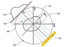 Two datum coordinate systems xy and ts are imagined in order to explain the positional relations and movements of features (0)–(7) in the figure. The xy and ts coordinate systems share the origin (6) and they are positioned on the same plane. That is, the xy plane and the ts plane are the same plane. Henceforth, this virtual plane will be called "the datum plane". In addition, a virtual circle centered at the abovementioned origin (6) is set on the datum plane (it will be called "the datum circle" henceforth). This datum circle (5) will be represents the orbit of the parallel beam irradiation optical system. Naturally, the origin (6), the datum circle (5), and the datum coordinate systems are virtual features which are imagined for mathematical purposes.