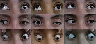 Neuro-ophthalmologic examination showing ophthalmoplegia affecting the left eye in a patient with Tolosa–Hunt syndrome. The central image represents forward gaze, and each image around it represents gaze in that direction (for example, in the upper left image, the patient looks up and right; the left eye is unable to accomplish this movement). The examination shows ptosis of the left eyelid, exotropia (outward deviation) of the primary look of the left eye, and paresis (weakness) of the third (oculomotor), fourth (trochlear) and sixth (abducens) left cranial nerves. | |