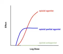 Not all opioid antagonists work the same. Some antagonists do not fully block agonists from binding to the receptor. These agonists are not necessarily considered partial antagonists, as they can act as agonists in some situations, and antagonists in others. Therefore, they are more often considered partial agonists. This means that they can block the activity of molecules that bind to opioid receptors by binding to the receptors with a higher affinity, making less opioid receptors available for agonists to bind. This may produce a partial response, rather than a full response[1].