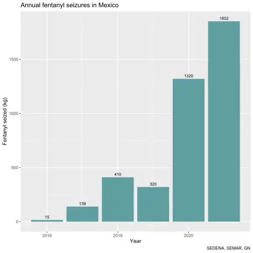 According to the United States Drug Enforcement Agency in 2023, China continued to be the primary source of fentanyl being imported into the United States, killing over 100 Americans every day.[129] Over a two-year period, close to $800 million worth of fentanyl was illegally sold online to the US by Chinese distributors.[130][131] The drug is usually manufactured in China, then shipped to Mexico, where it is processed and packaged, which is then smuggled into the US by drug cartels.[132] A large amount is also purchased online and shipped through the US Postal Service.[133] It can also be purchased directly from China, which has become a major manufacturer of various synthetic drugs illegal in the US.[134] AP reporters found multiple sellers in China willing to ship carfentanyl, an elephant tranquilizer that is so potent it has been considered a chemical weapon. The sellers also offered advice on how to evade screening by US authorities.[135] According to Assistant US Attorney Matt Cronin in 2019:
