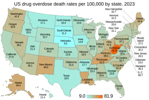 In the United States, there were approximately 109,600 drug-overdose-related deaths in the 12-month period ending January 31, 2023, at a rate of 300 deaths per day.[6] From 1999 to 2020, nearly 841,000 people died from drug overdoses,[7] with prescription and illicit opioids responsible for 500,000 of those deaths.[8] In 2017, there were 70,237 recorded drug overdose deaths; of those deaths, 47,600 involved an opioid.[9][10] A December 2017 report estimated that 130 people die every day in the United States due to opioid-related drug overdose.[11] The great majority of Americans surveyed in 2015 who used prescription opioids did not believe that they were misusing them.[12]