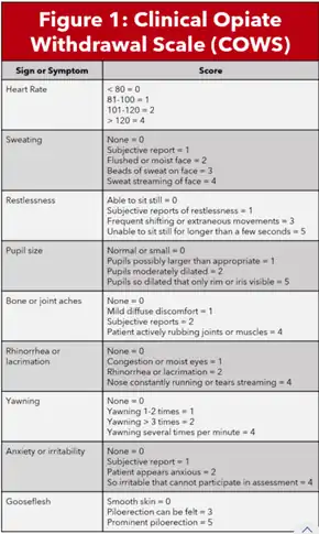 The diagnosis of opioid withdrawal requires recent use or exposure to opioids and symptoms consistent with the disorder.[15] The severity of symptoms can be assessed by validated withdrawal scales, such as the Clinical Opiate Withdrawal Scale (COWS).[16]