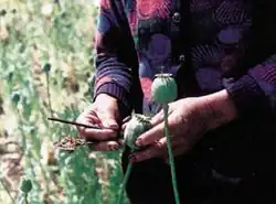 ![]() Opium poppy seed pod exuding latex from a cut | |