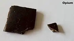 The English word for opium is borrowed from Latin, which in turn comes from Ancient Greek: ὄπιον (ópion), a diminutive of ὀπός (opós, "juice of a plant").[5] The word meconium (derived from the Greek for "opium-like", but now used to refer to newborn stools) historically referred to related, weaker preparations made from other parts of the opium poppy or different species of poppies.[6] The Mediterranean region holds the earliest archaeological evidence of human use of opium poppies dating back to over 5000 BCE, with cultivation beginning around 3400 BCE in Mesopotamia. Opium was widely used for food, medicine, ritual, and as a painkiller throughout ancient civilizations including Greece, Egypt, and Islamic societies up to medieval times.