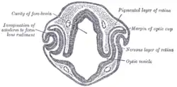 The eyes begin to develop as a pair of diverticula (pouches) from the lateral aspects of the forebrain. These diverticula make their appearance before the closure of the anterior end of the neural tube;[1][2] after the closure of the tube around the 4th week of development, they are known as the optic vesicles. Previous studies of optic vesicles suggest that the surrounding extraocular tissues – the surface ectoderm and extraocular mesenchyme – are necessary for normal eye growth and differentiation.[3]