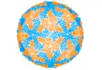 The virons are nonenveloped particles that are 70–80 nm in diameter. The virus particles are spherical in appearance and have icosahedral symmetry.[3] An outer and an inner capsid layer surround the genome, and have T=13 and T=2 symmetry, respectively.[2] The viron is constructed of two concentric protein shells, the subcore layer which contain 120 copies/particle of the VP3 and the core-surface layer composed of 780 copies/particle of the VP7. VP1, VP4, and VP6 are minor enzymatic proteins that are packaged along with the 10 genome segments within the central space of the virus core. The orbivirus outer-capsid layer is composed of two additional structural proteins (VP2 and VP5) which mediate cell-attachment and penetration during initiation of infection. The outer-capsid proteins are more variable than the core proteins and most of the non-structural proteins and the specificity of their reactions with neutralising antibodies determines the virus serotype.