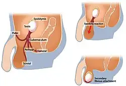 Twisting of the spermatic cord results in obstruction of the testicular venous drainage. Intense vascular engorgement and infarction may lead to testicular injury and sterility. If the cord is manually untwisted within approximately six hours the testis has a high chance of remaining viable. One in three cases results in dead testes, requiring orchiectomy.[2]