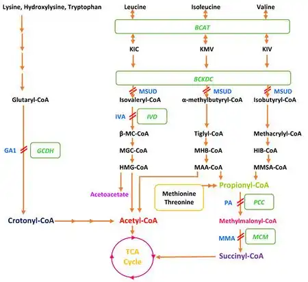 - ↑ 1.0 1.1 1.2 Ogier de Baulny H, Saudubray JM (2002). "Branched-chain organic acidurias". Semin Neonatol. 7 (1): 65–74. doi:10.1053/siny.2001.0087. PMID 12069539.