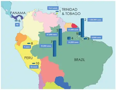 Between 1961 and 1980, OROV was reported in the northern state of Pará, Brazil, and from 1980 to 2004, OROV had spread to the Amazonas, Amapá, Acre, Rondônia, Tocantis, and Maranhão.[2]