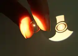 Around 60% of the eye's focusing power is provided by the cornea, and this is extremely sensitive to very small changes: 6 μm flattening of corneal thickness (around 5% of the thickness of a human hair) results in 1 diopter of changed vision in myopia.[9] Therefore, a specially shaped lens can be used to lightly press the cornea, causing it gradually to be reshaped to the correct shape for focused vision. The corrective effect lasts up to 72 hours once initially acclimatized, which is long enough to be a practical means of eyesight correction.[10] There is some evidence (see above) that unlike other eyesight correction mechanisms, Ortho-K may also reduce future or ongoing eyesight changes or increased myopia, although this is still being researched.