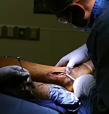 Prior to the invention of the orthopedic plate, metal wiring was used to solve the issue of bone fractures until about 1850. It was debated when the first use of this technique was actually made. Supposedly, the first use of this metal wiring was by the ancient Greeks.[2] The first recorded use of metal wiring was in 1755 in a French journal.[2] It was not until 1870, a Frenchman by the name of Laurent Berenger-Feraud began writing a book on internal fixation and bone fractures called "Traité de l'immobilisation directe des fragments osseux dans les fractures" (a book on direct immobilization of bone fragments of fractures).[2] All the information proved to be beneficial in medical procedures, however one thing lacked, the antiseptic treatments needed to properly administer these techniques. Joseph Lister, a British assistant surgeon who in 1877 tried his techniques on a patient and showed huge success. Carl Hausmann is credited with making the first successful plate using both nickel sheets and screws and creating a method of removal without reopening the wound site in 1886.[2] The years following focused on better surgical techniques and experimentation with other materials. Metals were the most common material for orthopedic plates, until cytotoxic tests were used to determine biocompatibility of metals put into the patients body post operation.