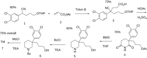 The reaction between 2-(3,4-Dichlorophenyl)-5-(tetrahydropyran-2-yloxy)pentanenitrile[11] (1) and methyl acrylate (2) gives 4-Cyano-4-(3,4-dichlorophenyl)-7-(oxan-2-yloxy)heptanoic aci [12] (3). Treatment with acid gives 3-[3-(3,4-Dichlorophenyl)-2,6-dioxopiperidin-3-yl]propyl acetate, CID:70104936 (4). Reduction of the imide with Borane dimethylsulfide afforded [182621-51-8] (5). The reaction of this intermediate with benzoyl chloride [98-88-4] gives CID:22741724 (6). Treatment with mesyl chloride completed the synthesis of CID:11812710 (7).