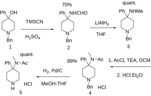 The reaction of 1-Benzyl-4-phenyl-4-piperidinol [63843-83-4] (1) with trimethylsilyl cyanide and subsequent Ritter reaction gave N-(1-Benzyl-4-phenylpiperidin-4-yl)formamide, CID:10979305 (2). The reduction of the formamide with lithium aluminium hydride gave 1-benzyl-N-methyl-4-phenylpiperidin-4-amine [172734-03-1] (3). Reaction with acetic anhydride gave CID:22741820 (4). Catalytic hydrogenation removal of the benzyl protecting group gave N-Methyl-N-(4-phenylpiperidin-4-yl)acetamide [172733-87-8] (5).