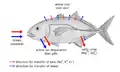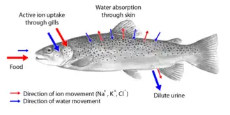 In teleost (advanced ray-finned) fishes, the gills, kidney and digestive tract are involved in maintenance of body fluid balance, as the main osmoregulatory organs. Gills in particular are considered the primary organ by which ionic concentration is controlled in marine teleosts.