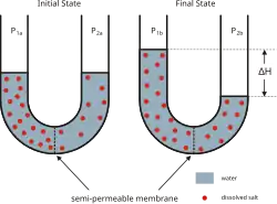 Osmosis (/ɒzˈmoʊsɪs/, US also /ɒs-/)[1] is the spontaneous net movement of solvent molecules through a selectively-permeable membrane from a region of high water potential (region of lower solute concentration) to a region of low water potential (region of higher solute concentration),[2] in the direction that tends to equalize the solute concentrations on the two sides.[3][4][5] It may also be used to describe a physical process in which any solvent moves across a selectively permeable membrane (permeable to the solvent, but not the solute) separating two solutions of different concentrations.[6][7] Osmosis can be made to do work.[8] Osmotic pressure is defined as the external pressure required to prevent net movement of solvent across the membrane. Osmotic pressure is a colligative property, meaning that the osmotic pressure depends on the molar concentration of the solute but not on its identity. Osmotic transport occurs through viscous flow of the solvent under a pressure gradient.[9][10]