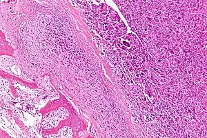 | Intermediate-magnification micrograph of an osteosarcoma (center and right of image) adjacent to non-malignant bone (left-bottom of image): The top-right of the image has poorly differentiated tumor. Osteoid with a high density of malignant cells is seen between the non-malignant bone and poorly differentiated tumor (H&E stain). | |