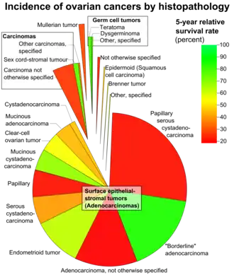 - ↑ 48.0 48.1 Kosary CL (2007). "Chapter 16: Cancers of the Ovary" (PDF). In Baguio RN, Young JL, Keel GE, Eisner MP, Lin YD, Horner MJ (eds.). SEER Survival Monograph: Cancer Survival Among Adults: US SEER Program, 1988–2001, Patient and Tumor Characteristics. SEER Program. Vol. NIH Pub. No. 07-6215. Bethesda, MD: National Cancer Institute. pp. 133–144. Archived from the original on 2013-10-10. Archived 2013-10-10 at the Wayback Machine