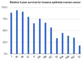 - ↑ 88.0 88.1 "Survival rates for ovarian cancer, by stage". American Cancer Society. Archived from the original on 29 October 2014. Retrieved 29 October 2014. Archived 29 October 2014 at the Wayback Machine