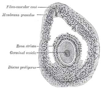 Once a month, one of the ovaries releases a mature egg (ovum), known as an oocyte. The nucleus of such an oocyte is called a germinal vesicle[6] (see picture).