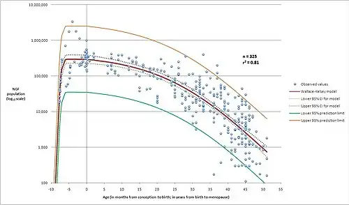 - ↑ Wallace WHB, Kelsey TW (2010). "Human Ovarian Reserve from Conception to the Menopause". PLOS ONE. 5 (1) e8772. arXiv:1106.1382. Bibcode:2010PLoSO...5.8772W. doi:10.1371/journal.pone.0008772. PMC 2811725. PMID 20111701.