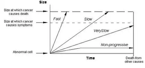 The arrow labeled "Non-progressive" represents a cancer that never causes problems because it is not growing at all. In other words, there are cellular abnormalities that meet the pathologic definition of cancer but never grow to cause symptoms—alternatively, they may grow and then regress. Although the concept of non-progressive cancers may seem implausible, basic scientists have begun to uncover biologic mechanisms that halt the progression of cancer.[3][4][5] Some cancers outgrow their blood supply (and are starved), others are recognized by the host's immune system (and are successfully contained), and some are not that aggressive in the first place.