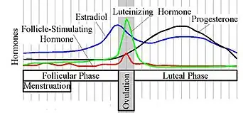Ovulatory cycle shifts are hypothesized to be regulated by sex hormones, primarily estradiol and progesterone, which become elevated at different times across the cycle. In particular, high levels of estradiol and low levels of progesterone, which peak at high fertility just prior to ovulation, have been shown to be correlated with several mating-related psychological changes.[26][27] However, some studies have only found correlations with changes in estradiol.[28][29] It is well-established that estradiol can act in the brain to produce other psychological and behavioral changes,[30] and animal studies tend to show a link between sexual behavior and estrogen concentrations.[31] Other hormones such as testosterone, follicle-stimulating hormone (FSH), luteinizing hormone (LH), and prolactin have been studied as possible correlates, but most have produced little to no effect.[28]