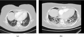 Oxaliplatin-induced pulmonary toxicity a) CT scan three months prior to symptoms of pneumonitis b) after respiratory symptoms: diffuse interstitial infiltrates and ground glass opacities[13]